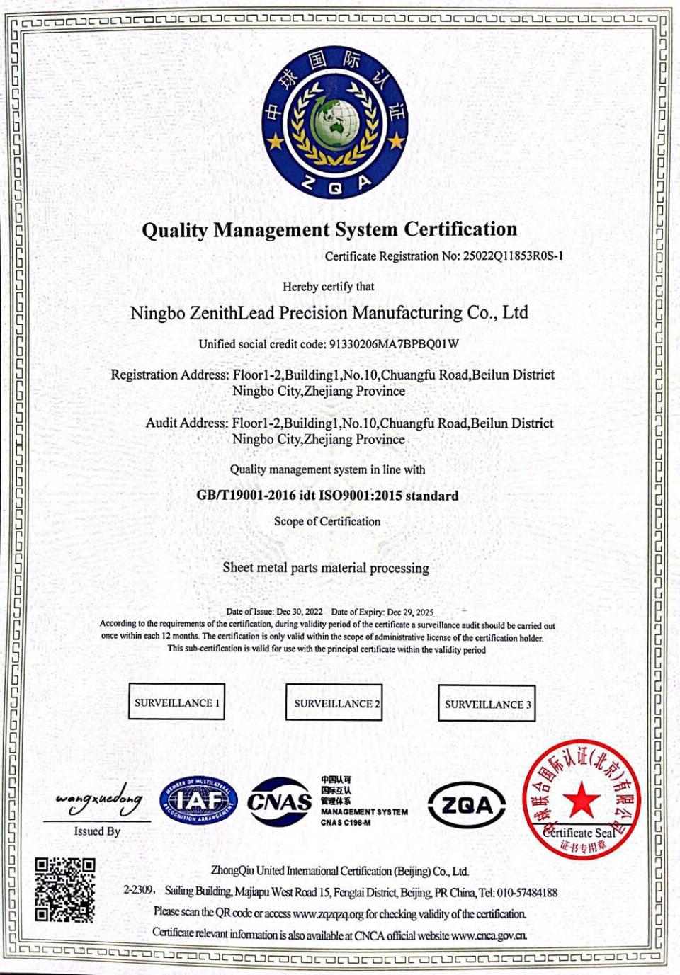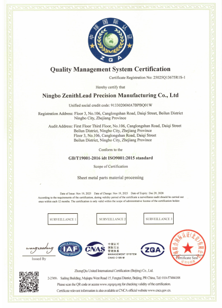 Компания Ningbo Zhongling Precision Manufacturing Co., Ltd. была основана в ноябре 2021 года и представляет собой современное производственное предприятие, специализирующееся в области прецизионной обработки металлов. Завод расположен на улице Дачэн, район Бэйлунь, город Нинбо, провинция Чжэцзян. Этот район является важным местом сбора для промышленности по производству высококачественного оборудования в Нинбо, с развитыми поддерживающими производственными цепочками и удобной транспортировкой и логистикой. Компания имеет стандартизированный цех по производству листового металла площадью 2300 квадратных метров и цех прецизионной штамповки площадью 3500 квадратных метров. Он имеет независимо спланированные производственные и перерабатывающие зоны, зоны контроля качества и тестирования, складские помещения, упаковочные помещения и офисные помещения с научно обоснованной планировкой для удовлетворения потребностей крупномасштабного производства. В настоящее время в компании есть основные отделы, такие как производство, контроль качества, технологии и бизнес. В штате более 40 сотрудников, 30% из них имеют степень бакалавра. Члены команды имеют многолетний опыт работы в сфере точного металлообработки, обеспечивая надежную поддержку качества продукции и технологических инноваций.